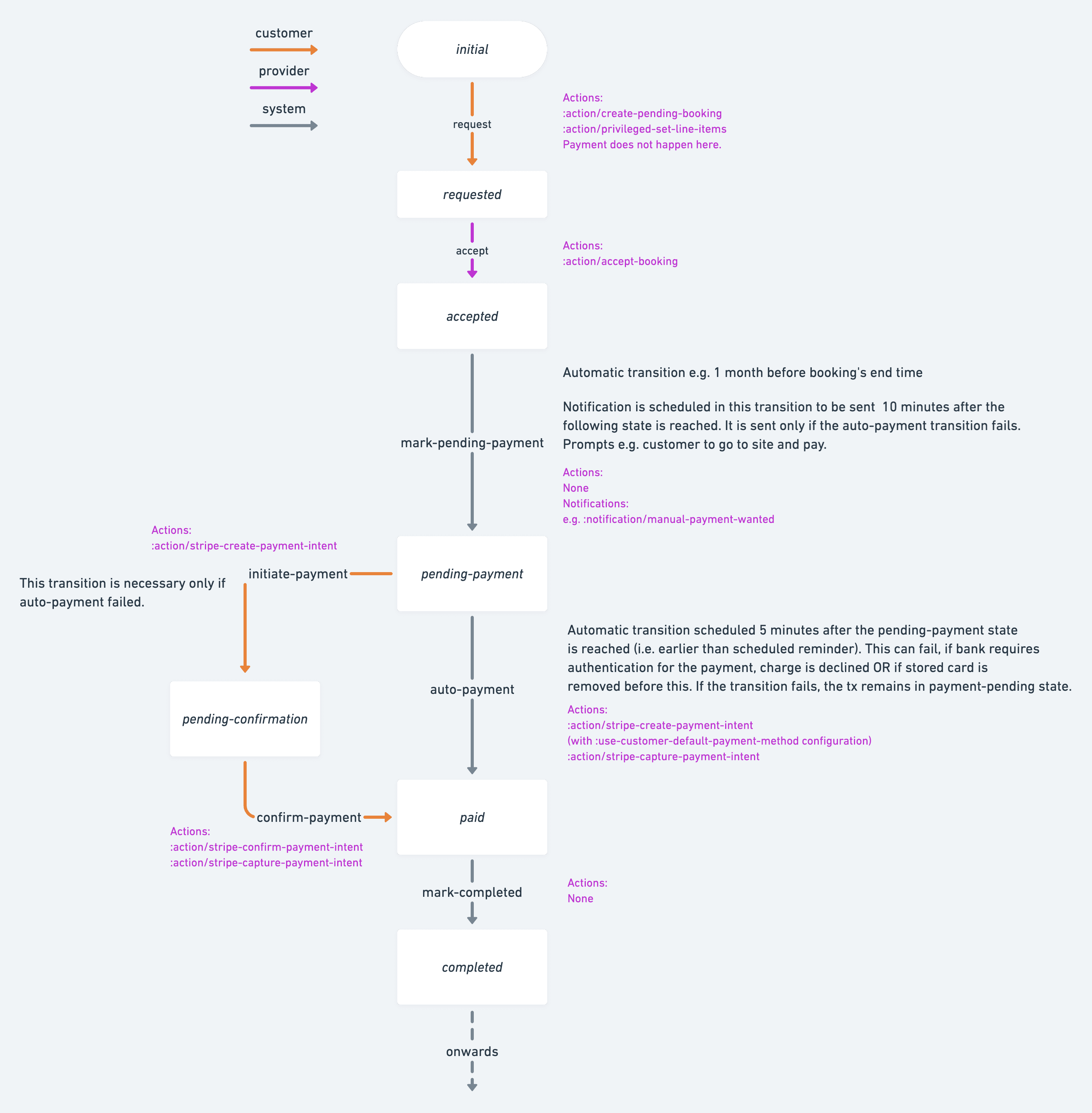 It is therefore always important to allow for a fallback payment path in your transaction process. In Sharetribe, only one transition from a state can be triggered automatically, so a fallback payment path must trigger upon a user action, as in the example.