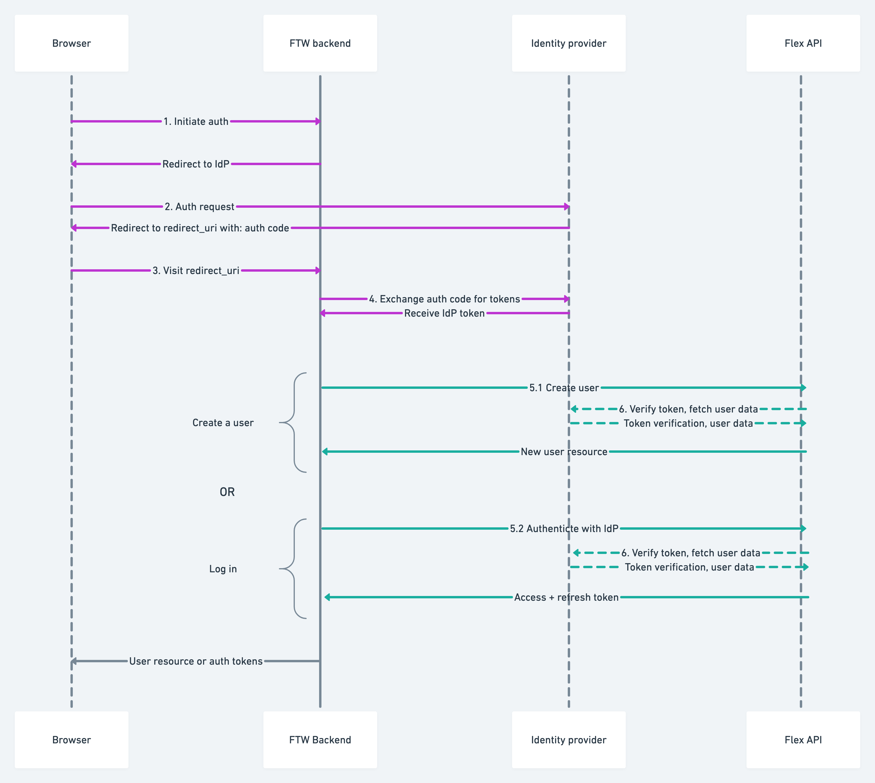 A general overview of using a third party identity provider when logging in or creating a user is as follows: