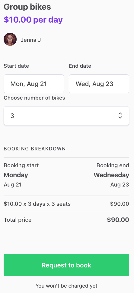 On our imaginary bike rental marketplace, some providers may have several similar bikes to rent. Instead of needing to create separate listings for each similar bike, we can add “seats” to a single listing. This makes it possible for customers to book several similar bikes in one go for the same time period.