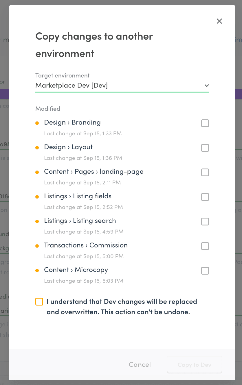 You will see a modal showing all the changes you have made that are currently not in Dev. Since we have not copied anything to Dev, the modal shows all of our no-code changes.